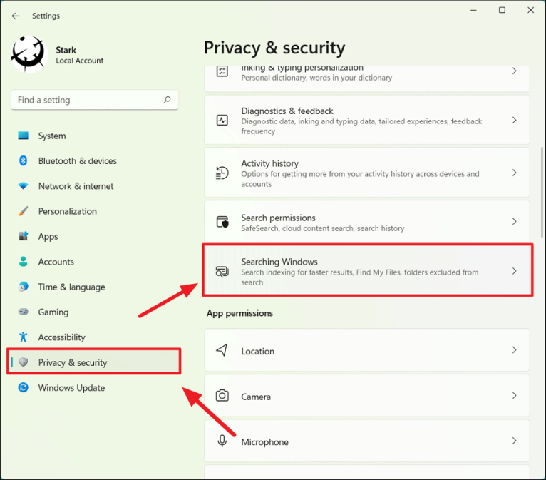 В настройках Windows нажмите «Конфиденциальность и безопасность» на левой боковой панели и выберите плитку «Поиск в Windows» на правой панели, как показано на изображении ниже.