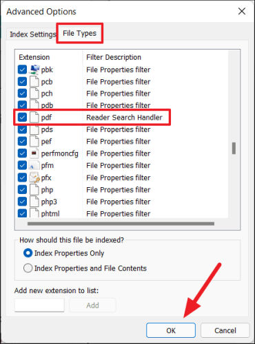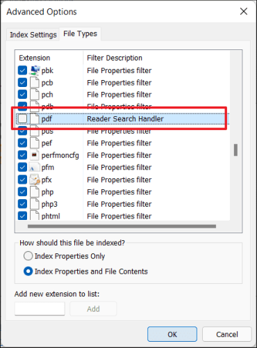 Чтобы исключить тип файла из индекса, отмените выбор его из списка и нажмите «ОК». Здесь мы исключаем файлы PDF.