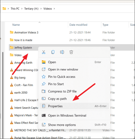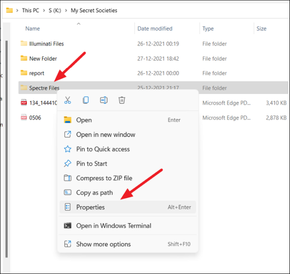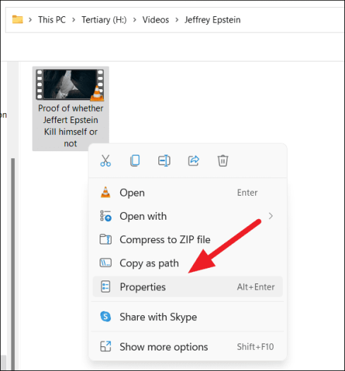 Вы также можете скрыть файл, выполнив те же действия, описанные выше. Щелкните правой кнопкой мыши файл, который хотите скрыть, и выберите «Свойства» в контекстном меню.