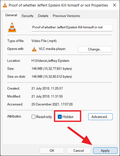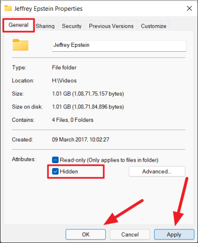 В диалоговом окне «Свойства» перейдите на вкладку «Общие» и установите флажок «Скрытый». Затем нажмите кнопку «Применить».