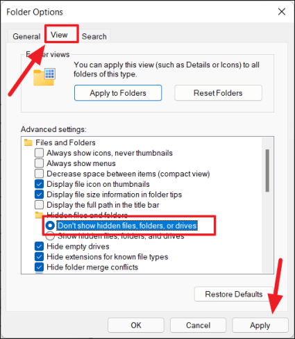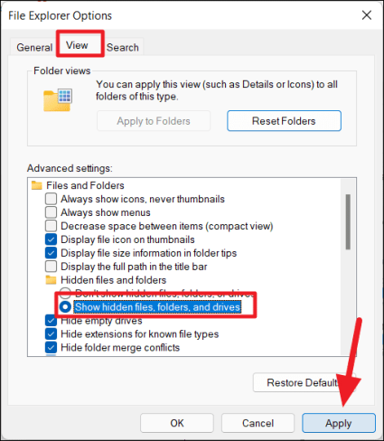В диалоговом окне «Параметры папки» перейдите на вкладку «Просмотр». Затем выберите «Показать скрытые файлы, папки и диски» в разделе «Дополнительные настройки». После этого нажмите «Применить» и выберите «ОК».
