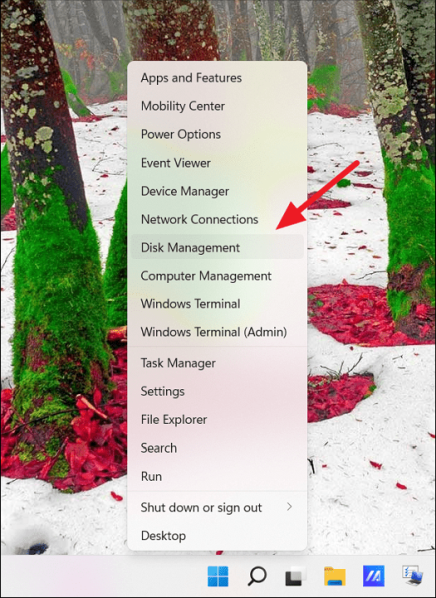 Сначала щелкните правой кнопкой мыши меню «Пуск» и выберите «Управление дисками» или откройте диалоговое окно «Выполнить», введите Diskmgmt.mscи нажмите Enter.