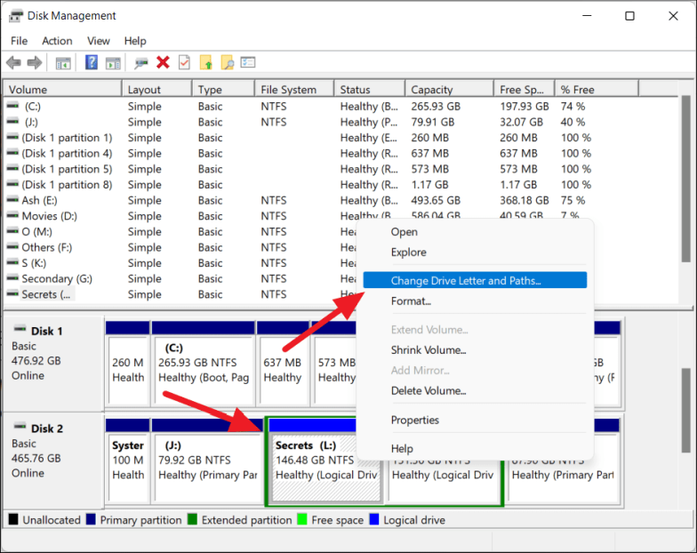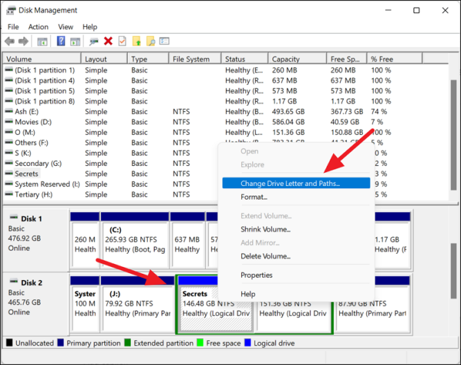 Когда откроется служебная программа «Управление дисками», щелкните правой кнопкой мыши диск, который нужно скрыть, и выберите параметр «Изменить букву диска и пути…». Кроме того, убедитесь, что вы выбрали правильный диск из правильного диска (если к вашему компьютеру подключено несколько жестких дисков).