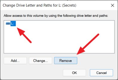 Это откроет небольшое диалоговое окно. Теперь выберите букву диска в этом диалоговом окне и нажмите кнопку «Удалить».