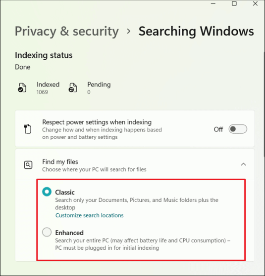 - Классический — это вариант по умолчанию для возврата результатов поиска. Если этот параметр включен, эти методы ищут файлы и папки только в папке профиля пользователя, включая документы, изображения, музыку, загрузки, видео и рабочий стол.