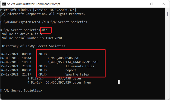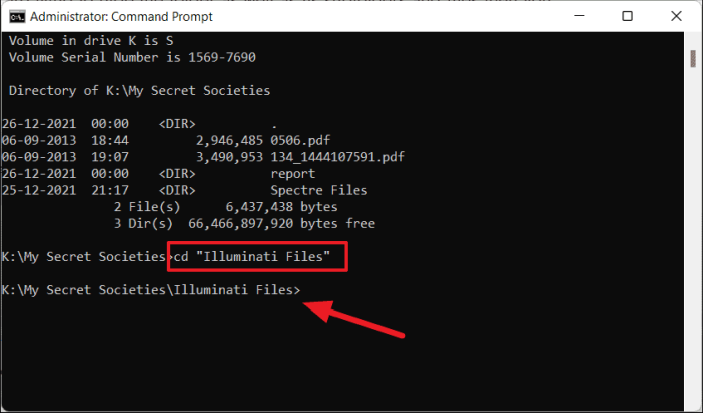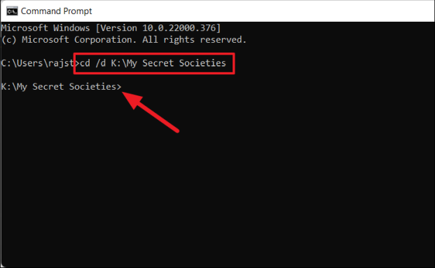 В приведенной выше команде cdиспользуется для изменения каталога, а /dпараметр используется для изменения текущего диска на определенную папку с другого диска. И K: My Secret Societiesэто путь к папке.