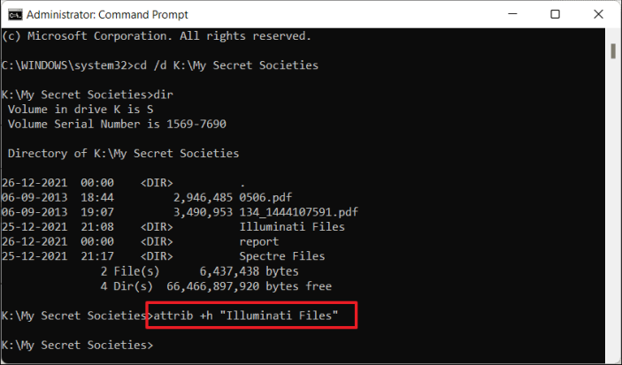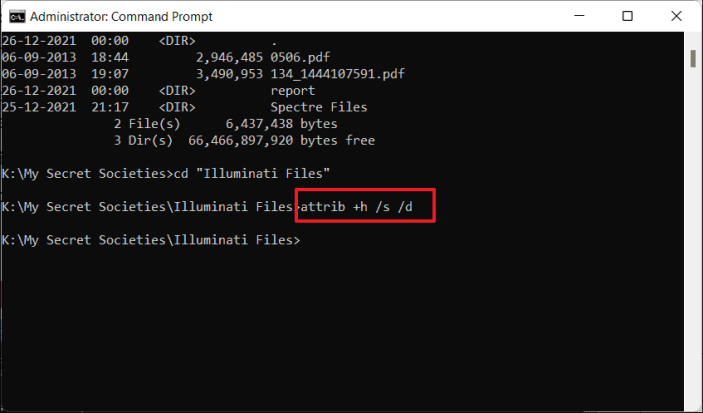 Приведенная выше команда добавляет скрытый атрибут в каталог с именем Illuminato Files.