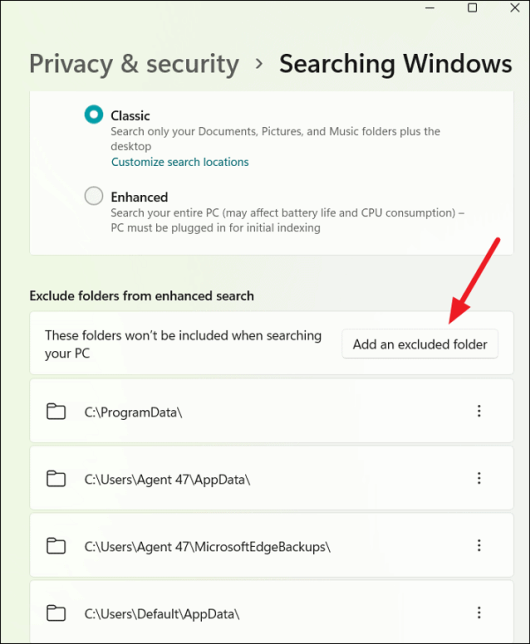 Чтобы исключить определенную папку из поиска, нажмите кнопку «Добавить исключенную папку» в разделе «Исключить папки из расширенного поиска».