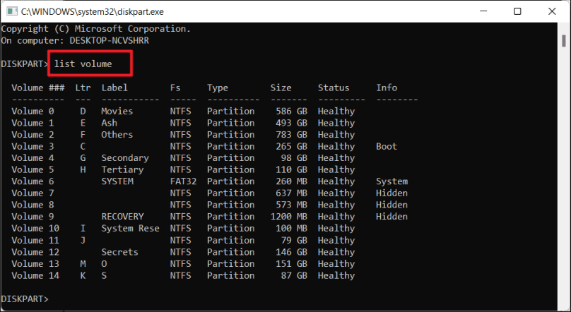Теперь давайте посмотрим, сколько дисков или томов доступно на компьютере. Для этого просто введите следующую команду: