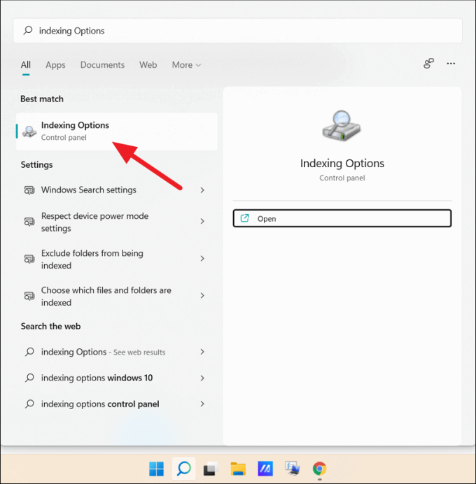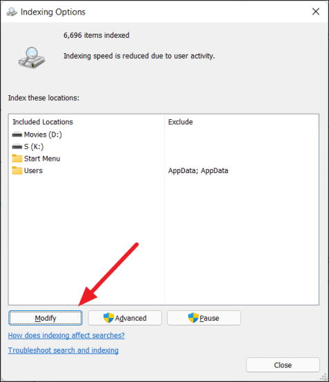 Сначала найдите «Параметры индексирования» в поиске Windows и щелкните первый результат, чтобы открыть диалоговое окно «Параметры индексирования».