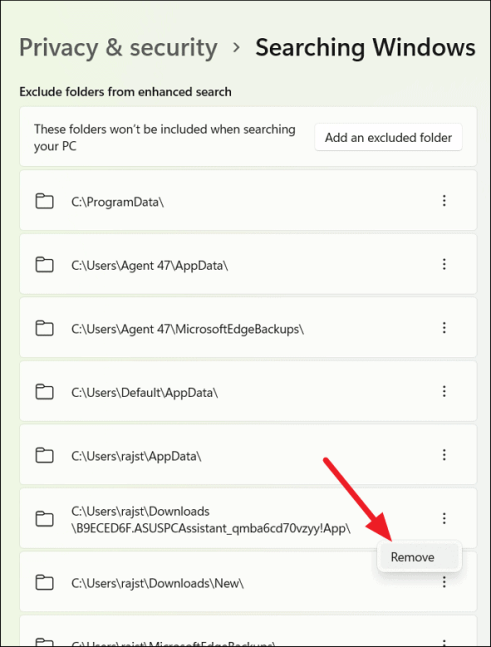 Чтобы удалить папку из списка исключенных папок, просто щелкните вертикальный эллипс (три точки) рядом с папкой и выберите «Удалить».