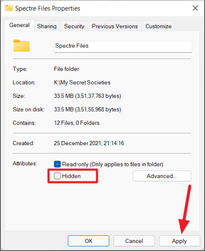 Затем установите флажок «Скрытый», затем выберите «Применить» и «ОК».