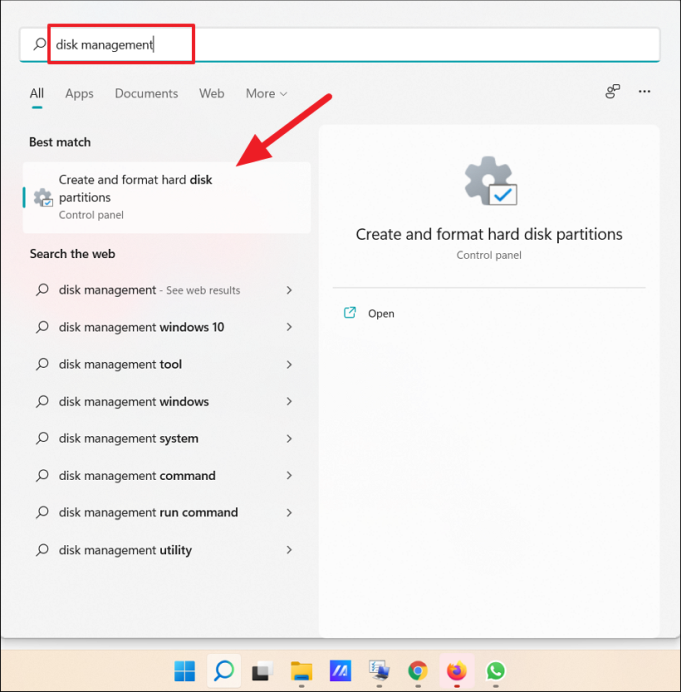 Сначала найдите «Управление дисками» в поиске Windows и откройте верхний результат.