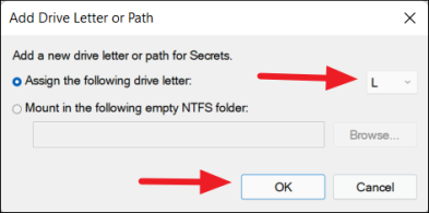 В диалоговом окне «Добавить букву диска или путь» выберите букву диска из раскрывающегося списка и нажмите «ОК».