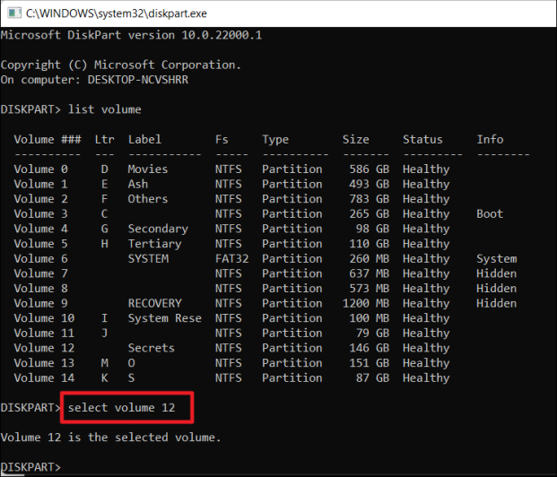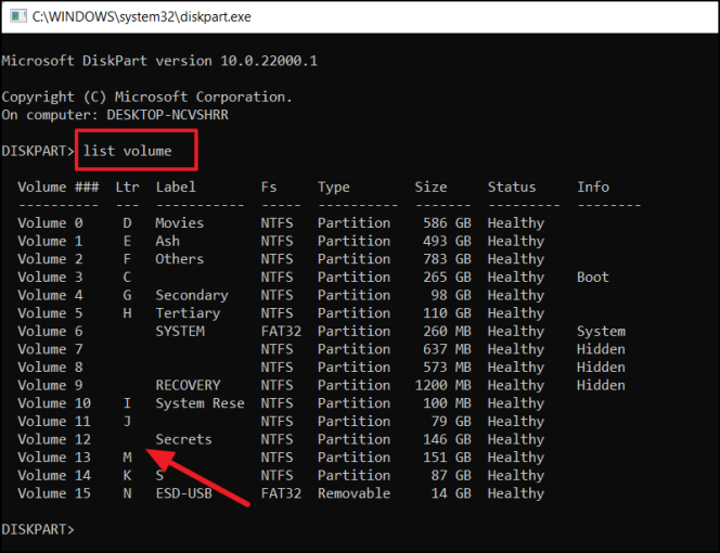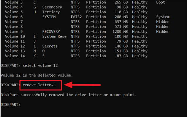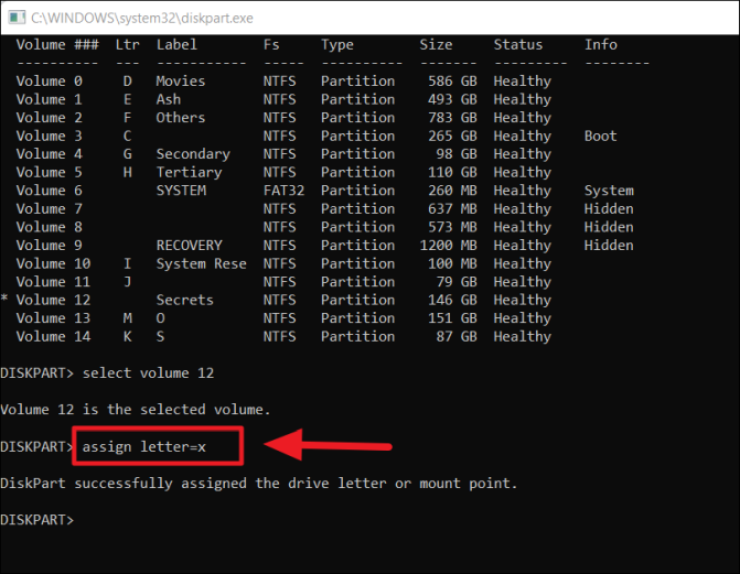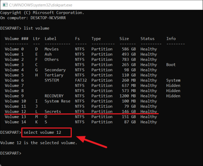 Где заменить «номер тома» на номер тома диска, который вы хотите скрыть. Здесь мы хотим скрыть диск с именем «Секреты», поэтому мы выбираем «Том 12»: