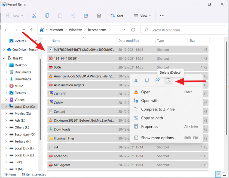 В папке «Последние элементы» вы увидите полный список недавно использованных файлов и папок. Вы можете выбрать только определенные файлы или все недавние файлы и папки и удалить их из списка.