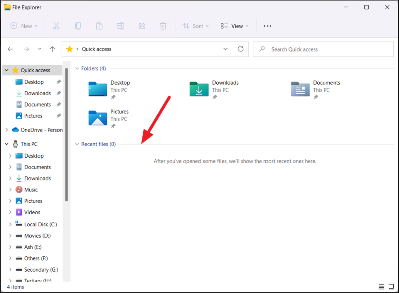 Как только вы это сделаете, вы больше не увидите недавно использованные файлы и часто используемые папки в области быстрого доступа.