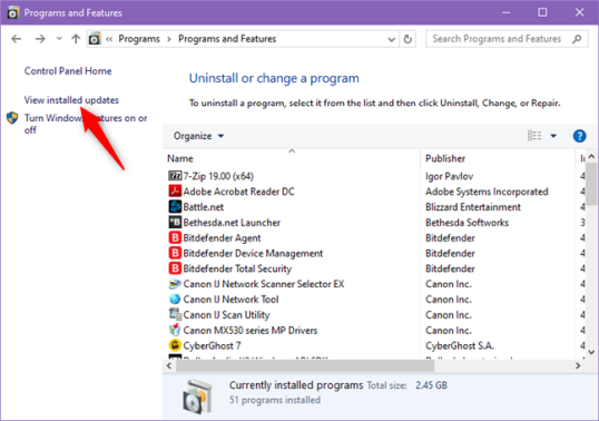 В левой части окна «Программы и компоненты» нажмите «Просмотр установленных обновлений».