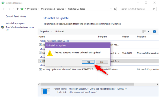 Windows 10 попросит вас подтвердить, что вы хотите удалить это обновление. Ответьте Да, если вы все еще делаете, или Нет, если вы передумали.