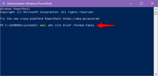 Начните с запуска командной строки или Powershell от имени администратора. Затем введите следующую команду: wmic qfe list brief /format:table.