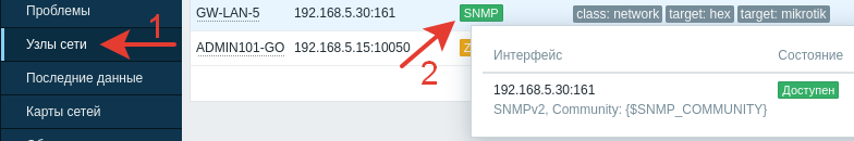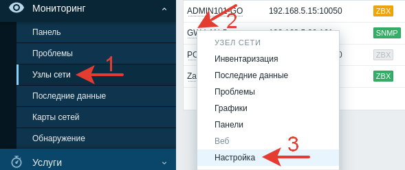 В боковом меню выбираем «Узлы сети» (Hosts).