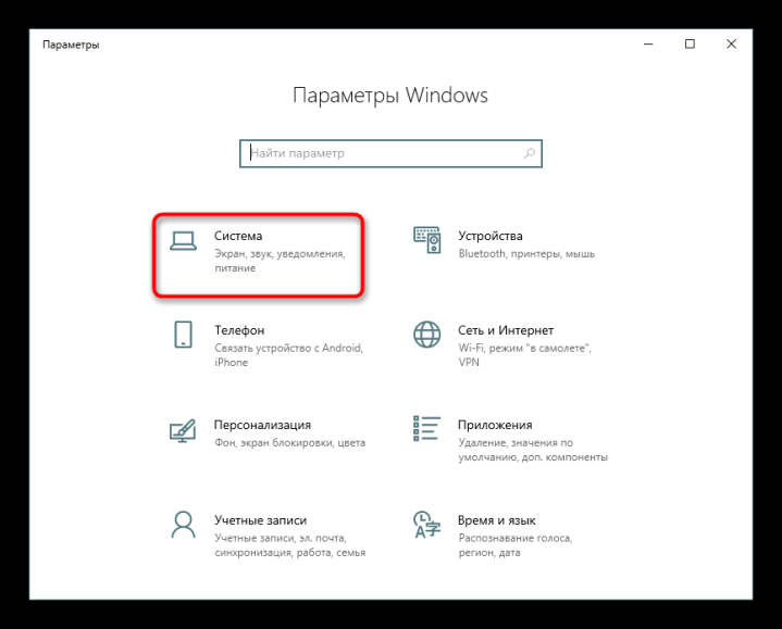 - Нажмите одновременно на «Виндовс» и I на клавиатуре. Либо запустите окно «Параметры» через «Пуск» (иконка в виде шестерни). Перейдите в раздел для системы.