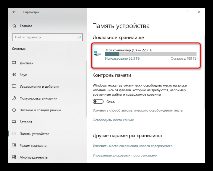 - Откройте пункт «Память». Щёлкните по системному диску.