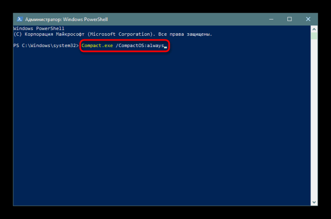 - Впишите строчку Compact.exe /CompactOS:always и нажмите на Enter.