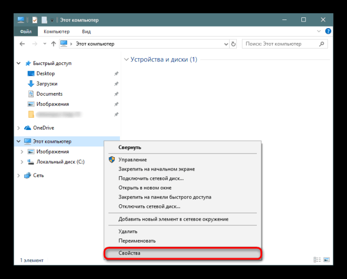 - Кликните по разделу «Этот компьютер» в «Проводнике» или на «Рабочем столе». Выберите пункт со свойствами.