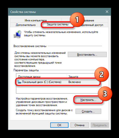 - Откройте вкладку для защиты системы. Выберите системный диск и нажмите на «Настроить».