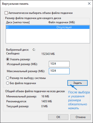 По умолчанию в параметрах будет стоять «Автоматически выбирать объём файла». Чтобы задать вручную размер файла подкачки, уберите птичку с автоматического определения, поставьте значение «Указать размер», вбейте нужный размер в мегабайтах и кликните по «Задать». Сохраните изменения и перезапустите компьютер.