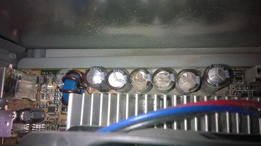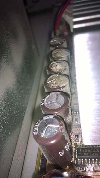 Первоначально, почему то подозрение было на блок питания, но после открытия боковой крышки и проведения внешнего осмотра выявились ужасного вида конденсаторы.