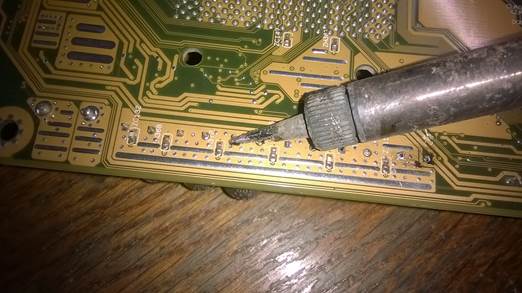 Выпаиваем старые, вздутые конденсаторы с обратной стороны платы. Паять нужно аккуратно, чтоб не повредить соседние дорожки и другие детали. Посадочные отверстия можно очистить от старого припоя иголкой. В этот раз припой на мат. плате оказался с большим содержанием свинца, выпаивался долго и сложно.