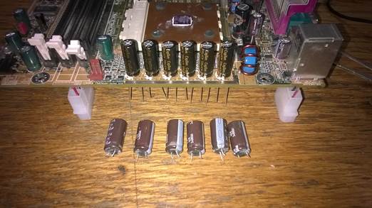 Подготавливаем конденсаторы для замены. Номинал конденсаторов написан на их корпуса. В нашем случае это 2200uF 6,3V. Покупаем такие же или очень близкие по номиналу. Напряжение меньше 6,3V не подойдет. Больше можно, но не меньше. Конденсаторы с других старых мат. плат брать не рекомендую. Они внешне могут быть нормальные, а внутри уже покойники или близки к этому состоянию.