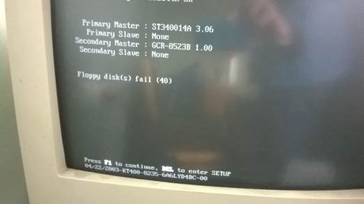 Собираем и проверяем работу. ПК запустился, но остановился при загрузке с сообщением Floppy disk fail (40). Для продолжения нужно нажать F1. Система проверяет дискетный дисковод и не находит.