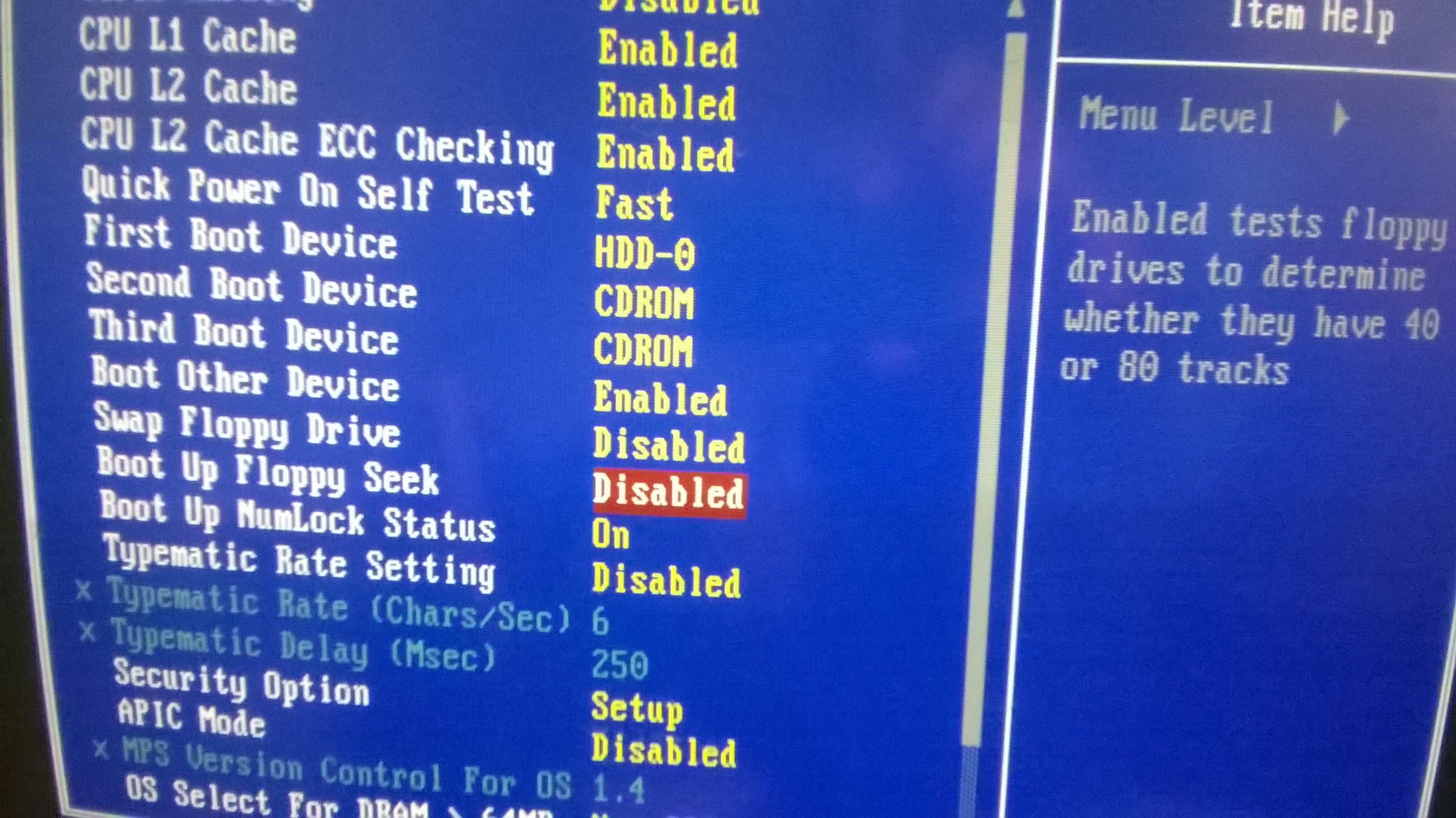 Каждый раз жать F1 неудобно. Идем в BIOS и выставляем опцию Boot Up Floppy Seek в положение Disabled (отключено). Сохраняем настройки F10.