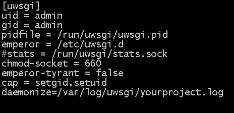 идем дальше. Добавляем модуль в автозагрузку, для этого, добавляем в файл /etc/uswgi.ini параметр daemonize=/var/log/uwsgi/yourproject.log. В итоге файл должен выглядеть так