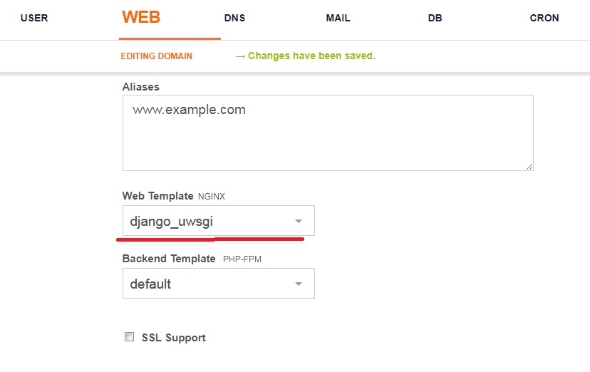 Теперь через WEB интерфейс выбираем наш шаблон djago_wsgi