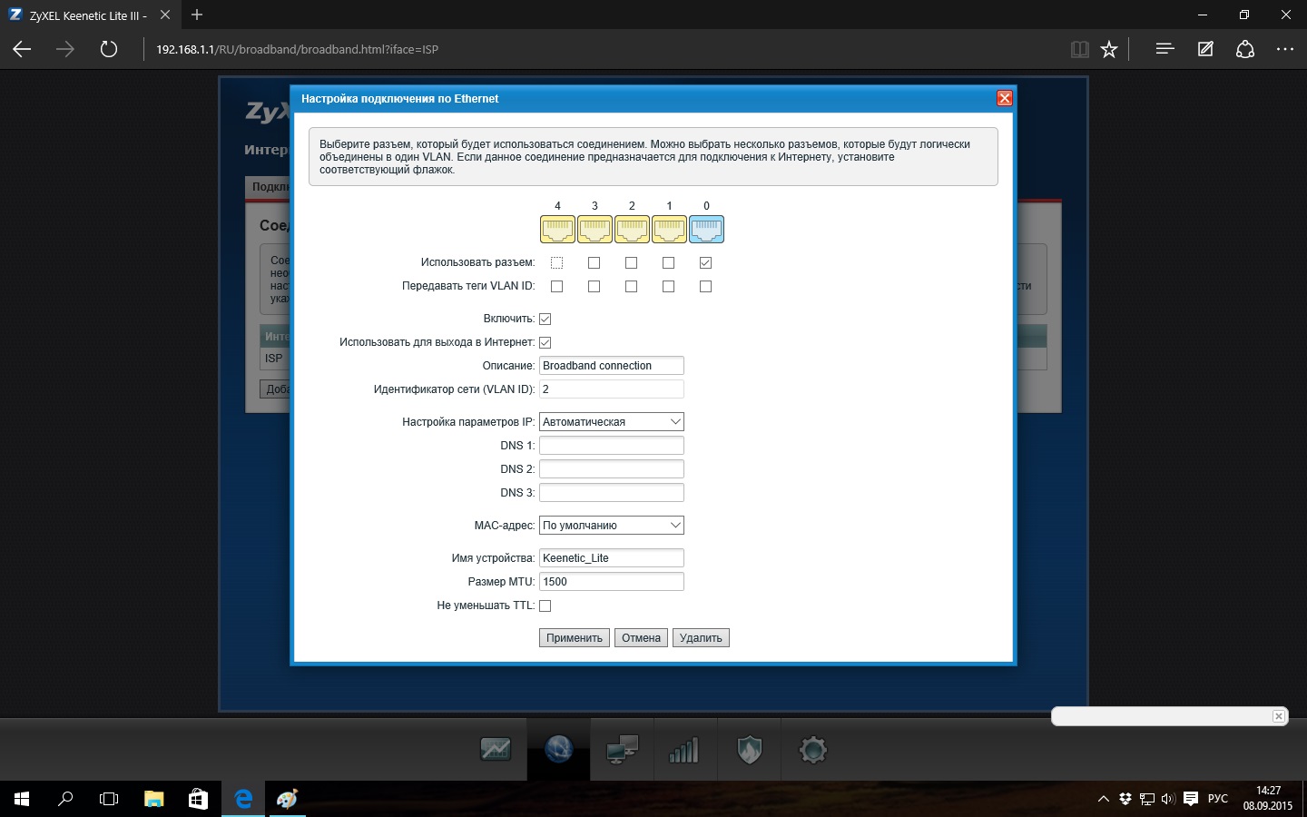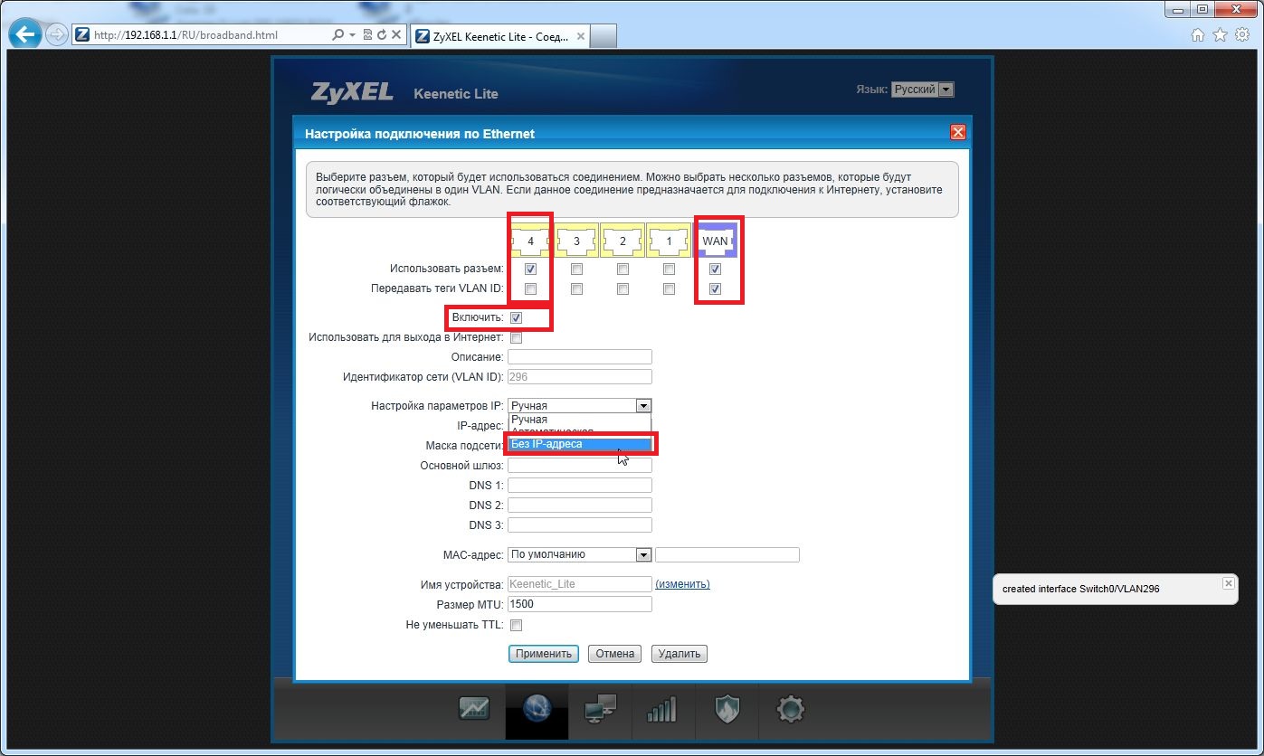 - Ставите в настройках IP «Автоматическая». Убедитесь, что галочками отмечены «Включить», «Использовать интерфейс для выхода». Синий разъём должен быть тоже выделен птичкой.