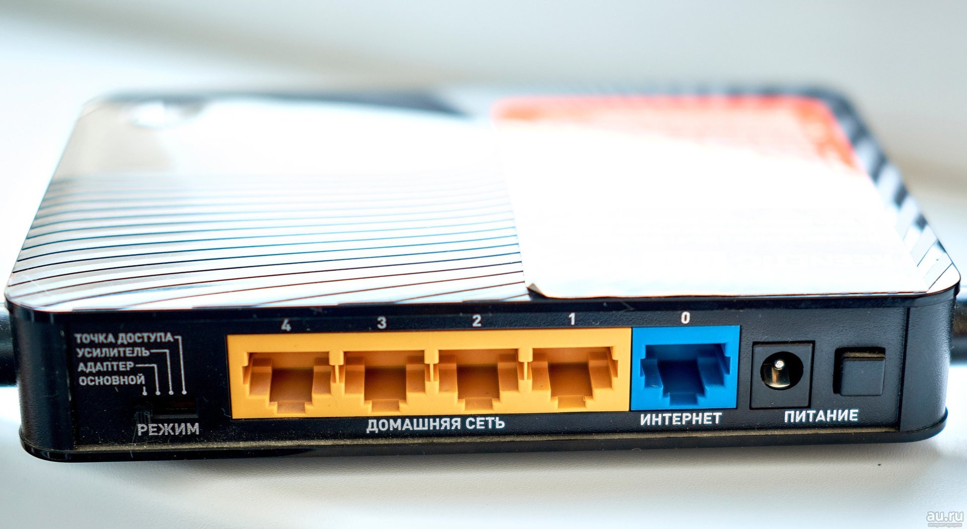 Далее идёт стандартный набор выходов: синий для интернета, 4 жёлтых для домашней сети. Крайнее гнездо предназначено для подключения адаптера питания.