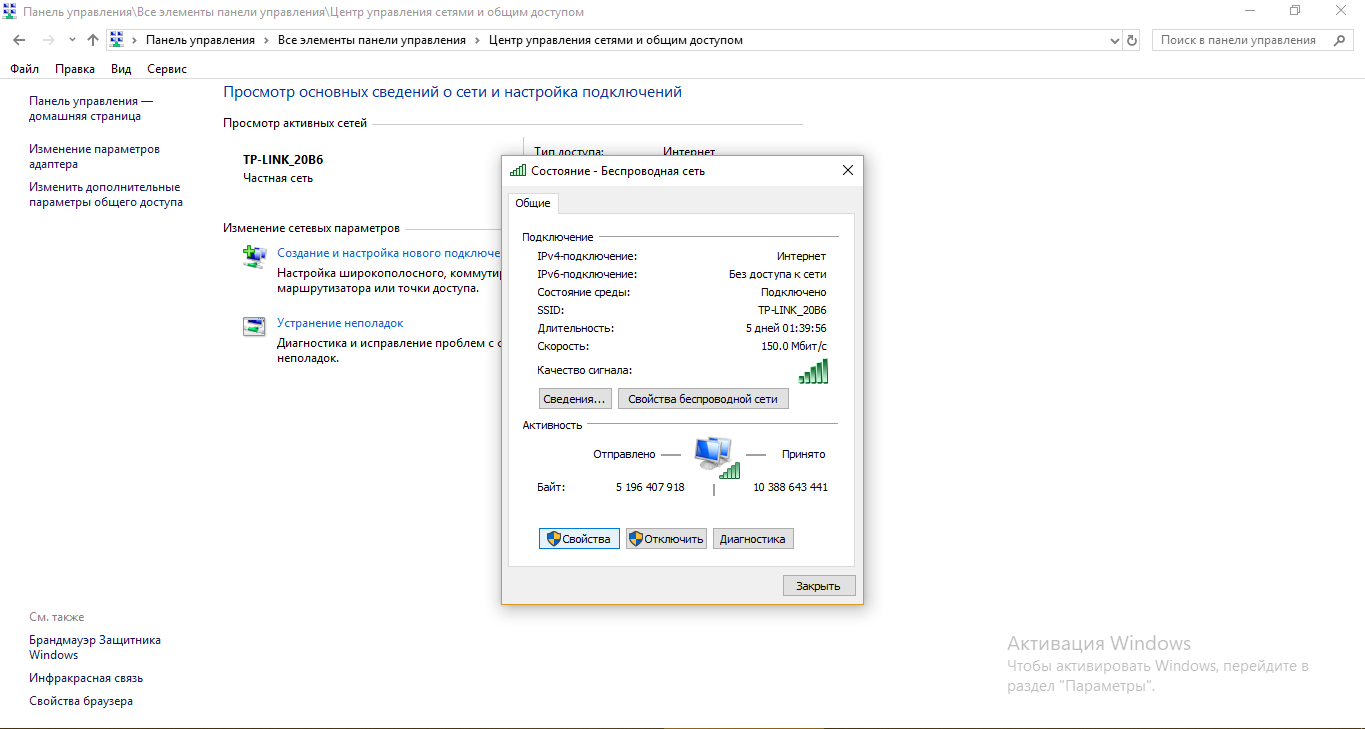 - Открываем «Центр управления сетями» через «Панель управления», затем уже в нём ищем синее наименование сети (напротив слова «Подключения»). Щёлкаем по нему и затем по кнопке «Свойства».