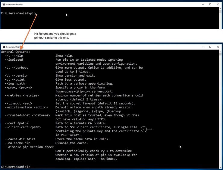 • Вы увидите справочный текст менеджера пакетов Python под названием “pip”. Если вы получите уведомление об ошибке, повторите этапы установки Python, и убедитесь в том, что вы обладаете рабочей версией Python. Большая часть проблем, с которыми вы можете столкнуться, будут иметь то или иное отношение к неправильной настройке PATH. Переустановка и подтверждение того, что опция “Add Python to PATH” была активирована, должны исправить эту проблему.