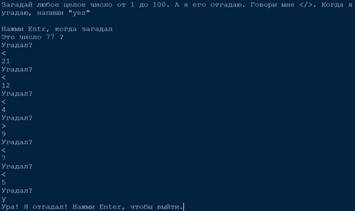 input('Ура! Я отгадал! Нажми Enter, чтобы выйти.')