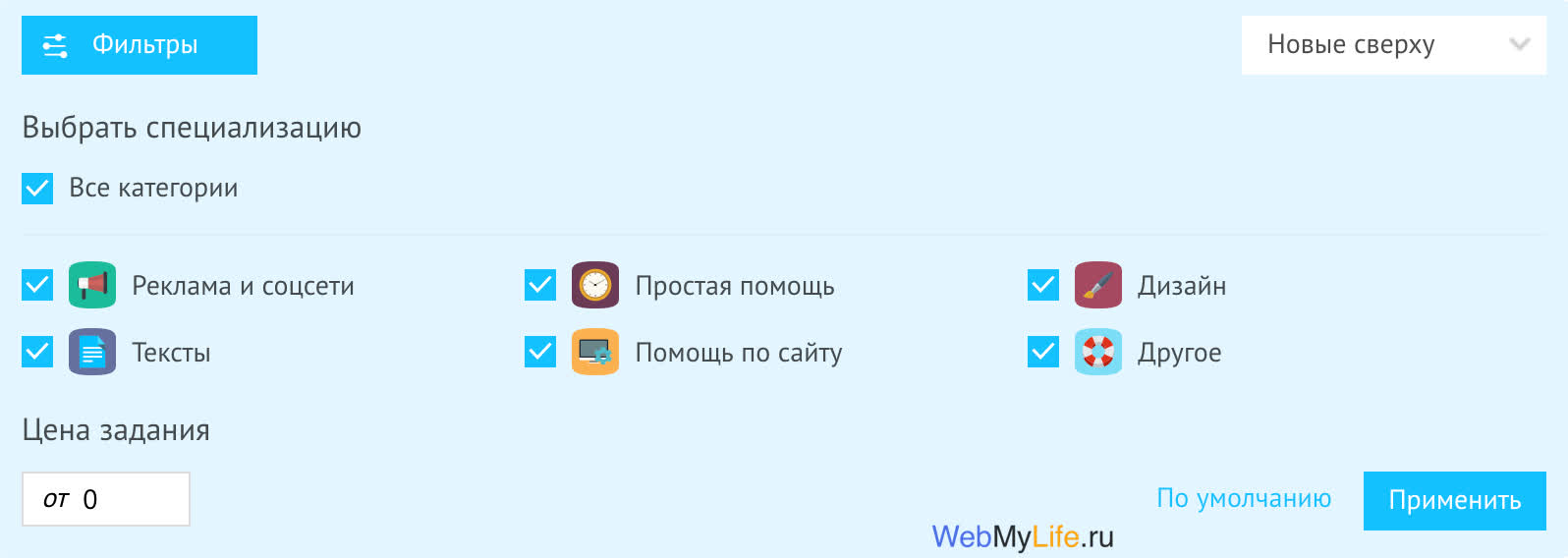 Если Вы не имеете особых навыков, советую выбрать: Реклама и соцсети, Простая помощь, Тексты и Другое. Эти категории являются простыми и большинство заданий из них легко выполнить.