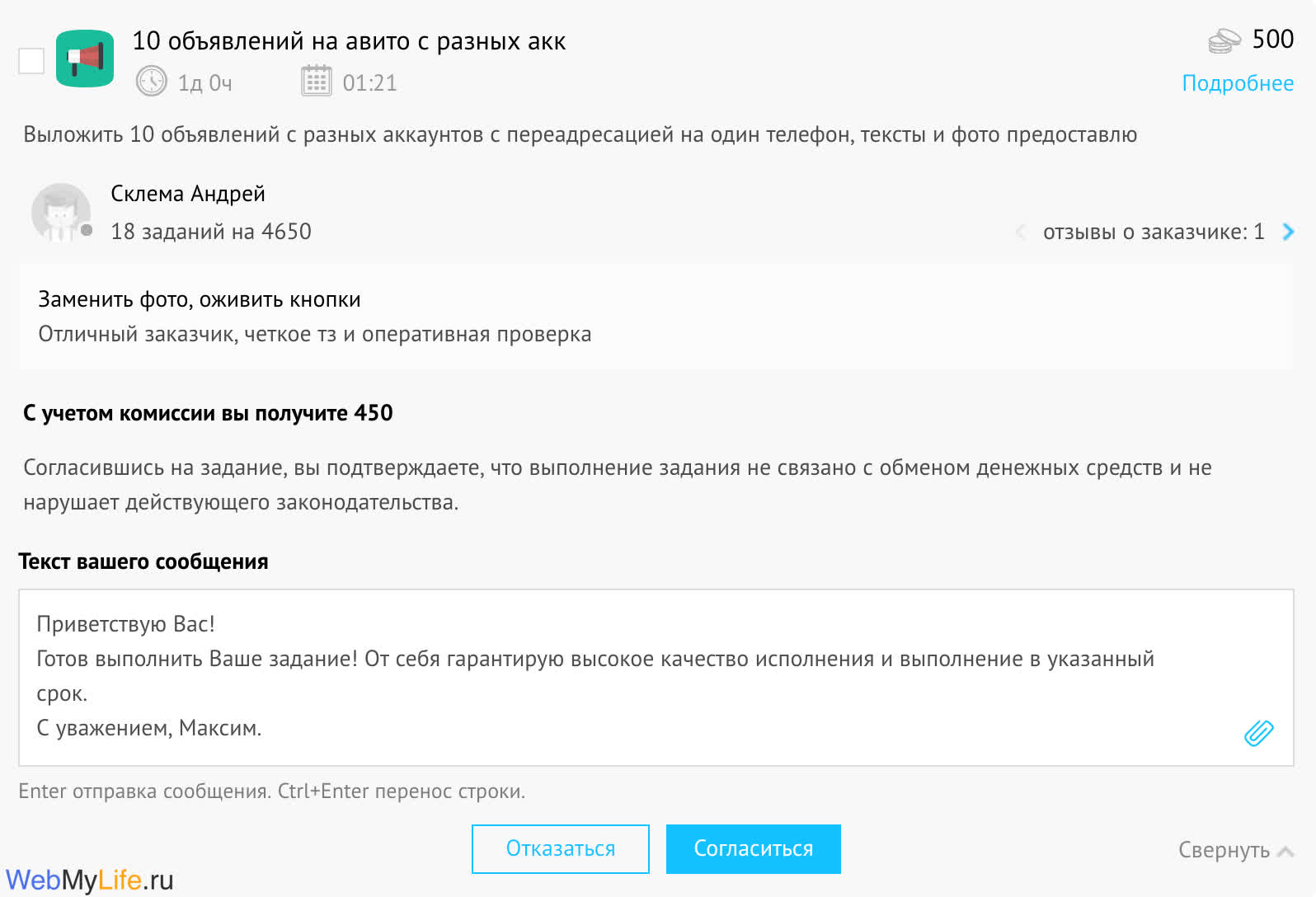 Многие в сети советуют писать чуть ли не романы, отписываясь на работу заказчику. Это целесообразно только в случае, если задание профильное и Вам нужно прикреплять портфолио, писать о достижениях и т.п. В случае простых заданий – это НЕ НУЖНО! Вы утомите заказчика, читая длинный текст, который не будет нести особой смысловой нагрузки для задания.