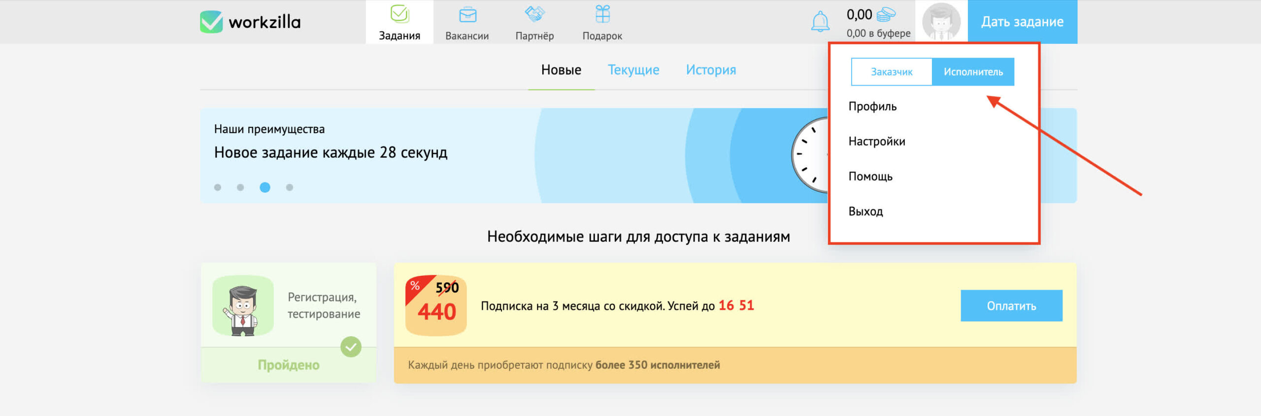 4. После активации Вы попадаете на страницу «Исполнитель». Она то и будет основной в процессе работы, ведь мы хотим зарабатывать, а не давать задания.
