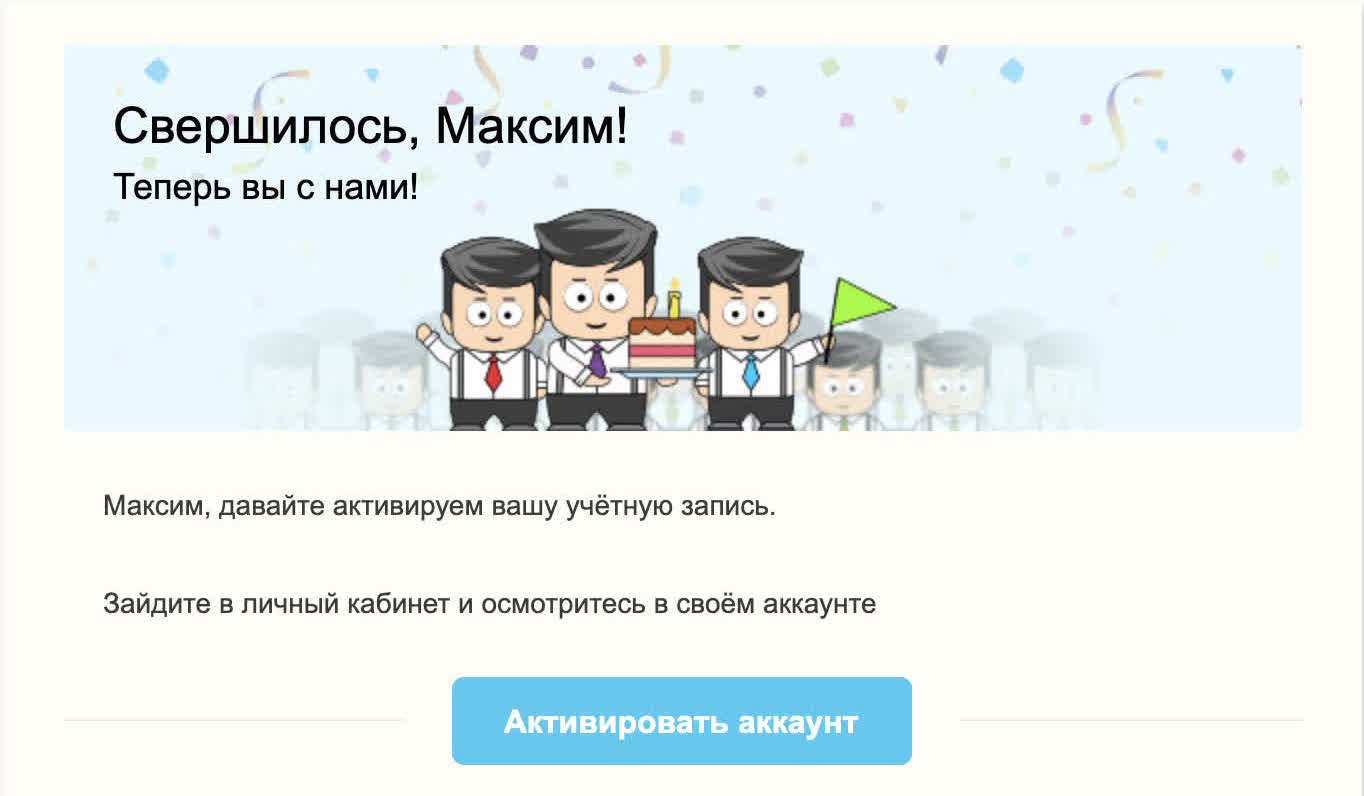 3. Зайдя на почту получаем нарядное поздравление с регистрацией и возможность активировать в системе свою учётную запись, нажав большую синюю кнопку «Активировать аккаунт».