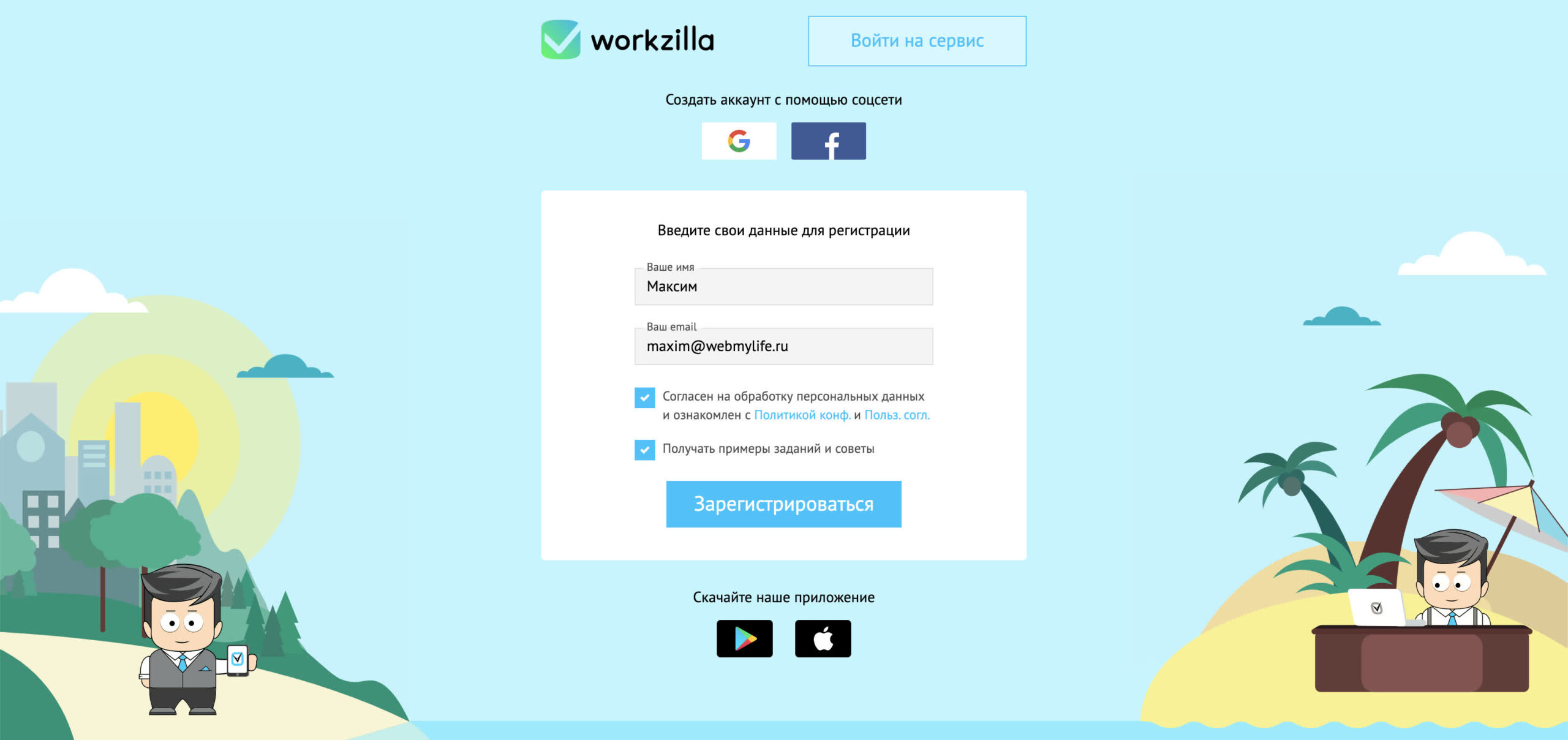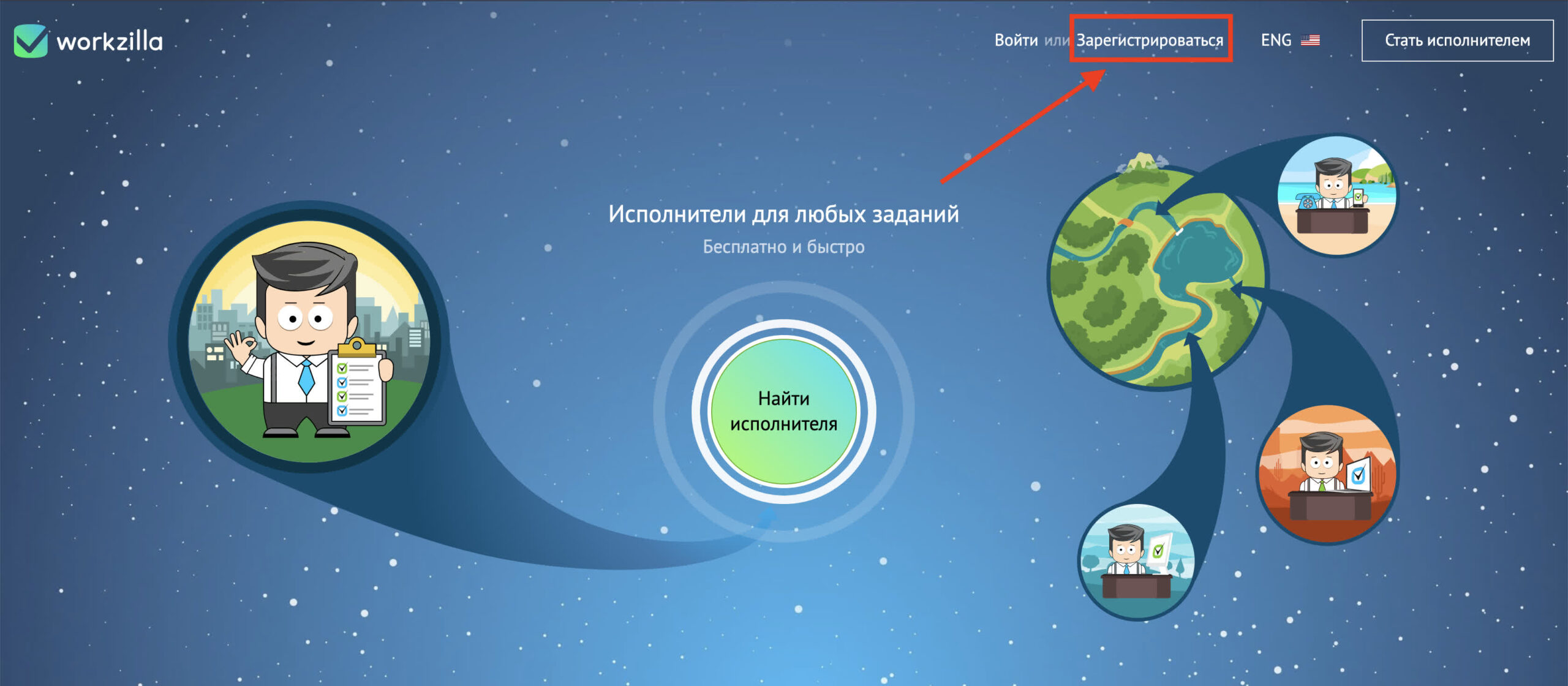 1. Переходим на главную страницу сайта work-zilla.com. Нажимаем кнопку «Зарегистрироваться».