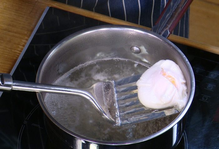 Приготовить яйца пашот: в небольшой кастрюле вскипятить воду, добавить уксус, с помощью венчика сделать маленький водоворот и в центр воронки вылить яйцо. Убавить огонь и варить 2–3 минуты, затем шумовкой выложить яйцо на бумажное полотенце. Так же приготовить второе яйцо.