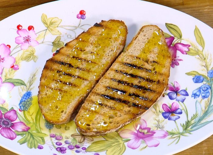 Разогреть сковороду-гриль и подсушить хлеб с двух сторон, затем снять со сковороды и сбрызнуть оливковым маслом.